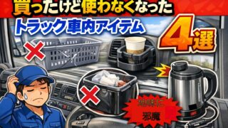 百均の小物入れや吹き出し口ドリンクホルダー、市販のゴミ箱など、トラック運転手が実際に使ってみてやめた車内アイテム4選を理由付きで紹介します。